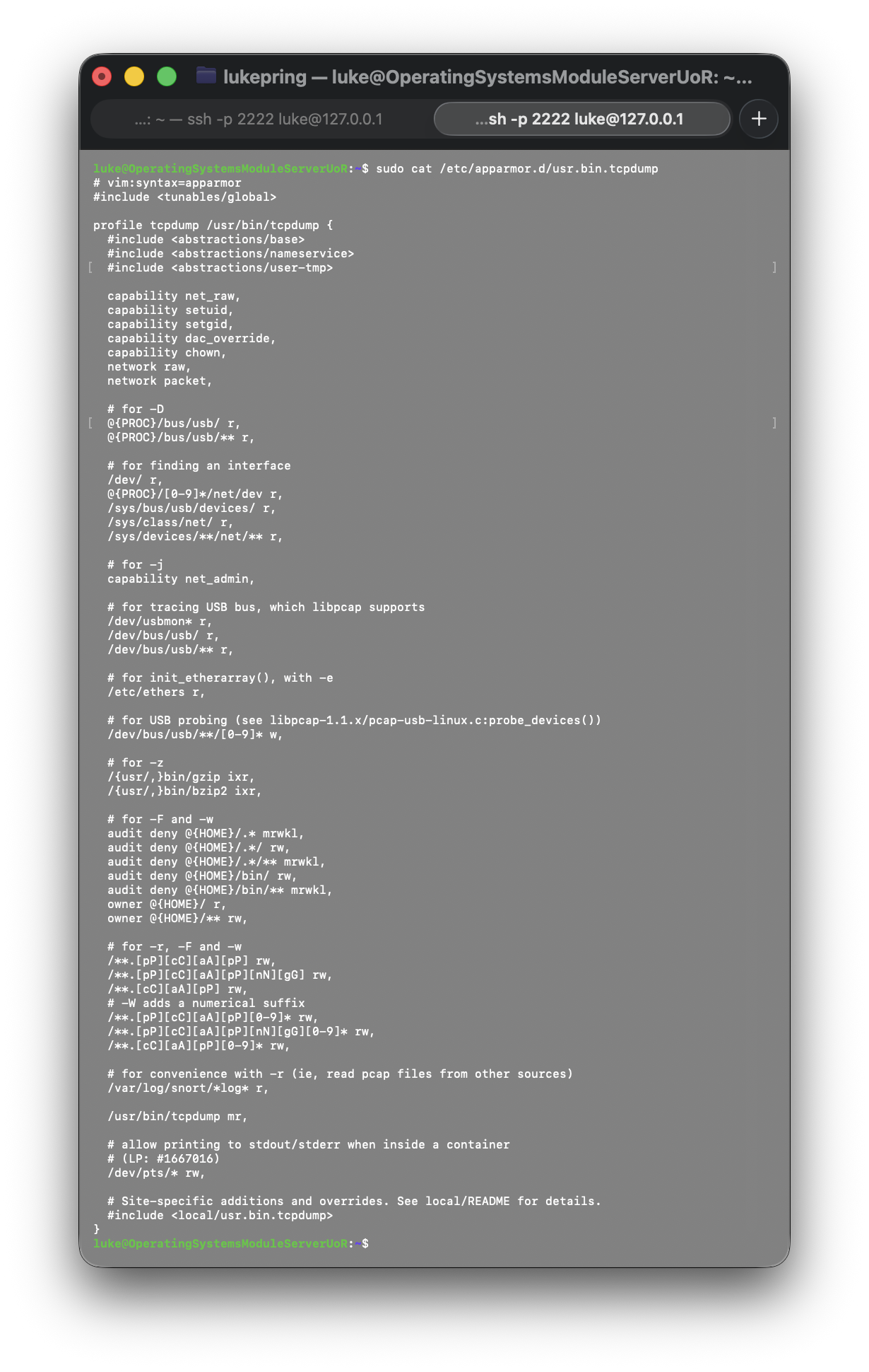To examine a specific profile, I used the sudo cat /etc/apparmor.d/usr.bin.tcpdump