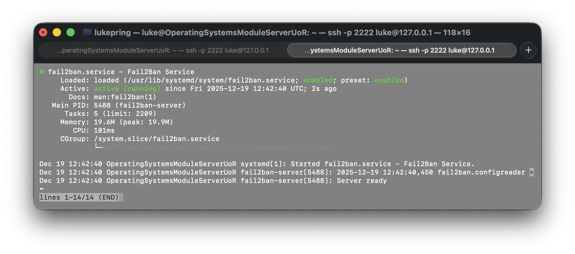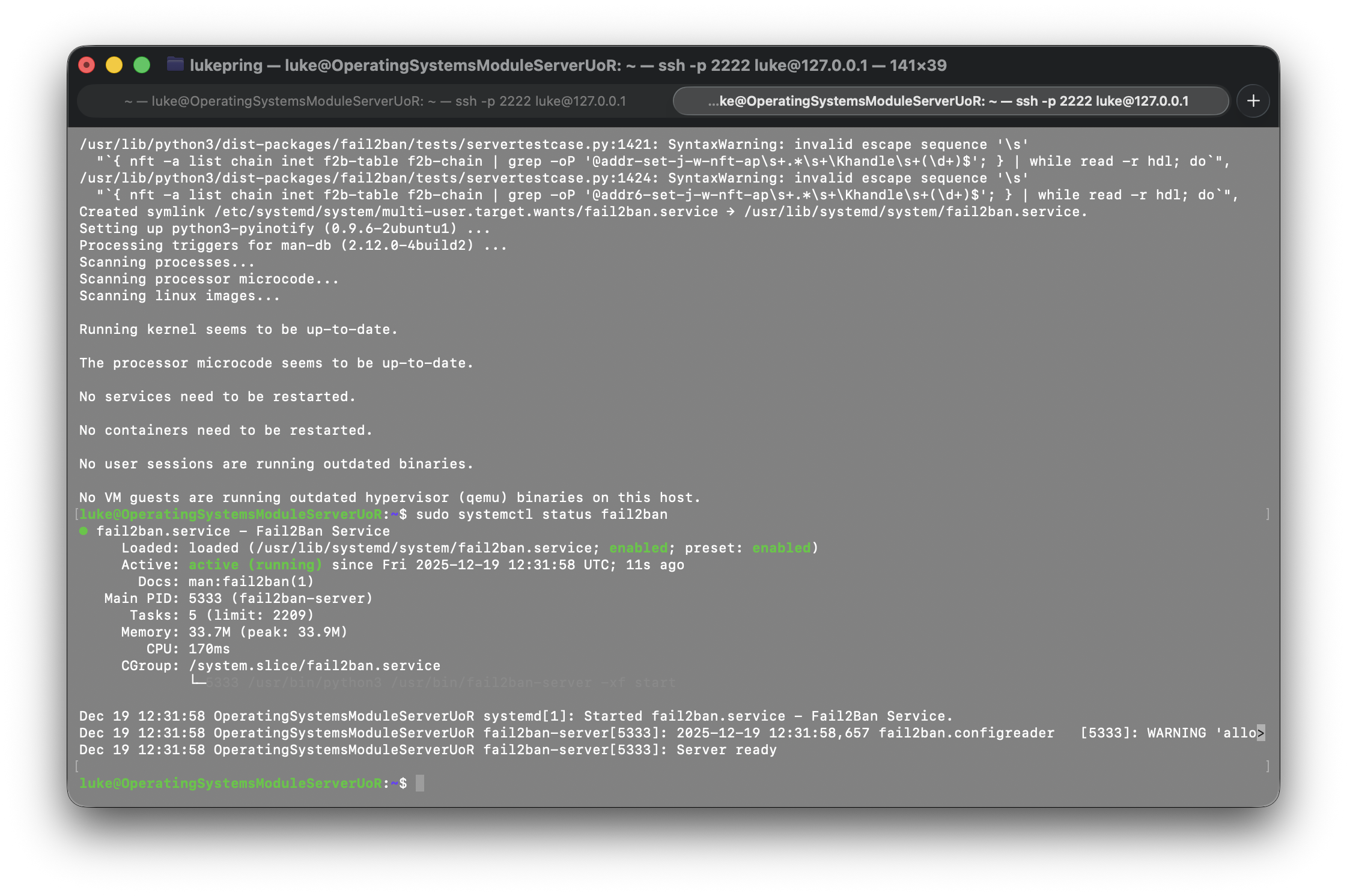 To ensure the service was running, I used the sudo systemctl status fail2ban command. The result