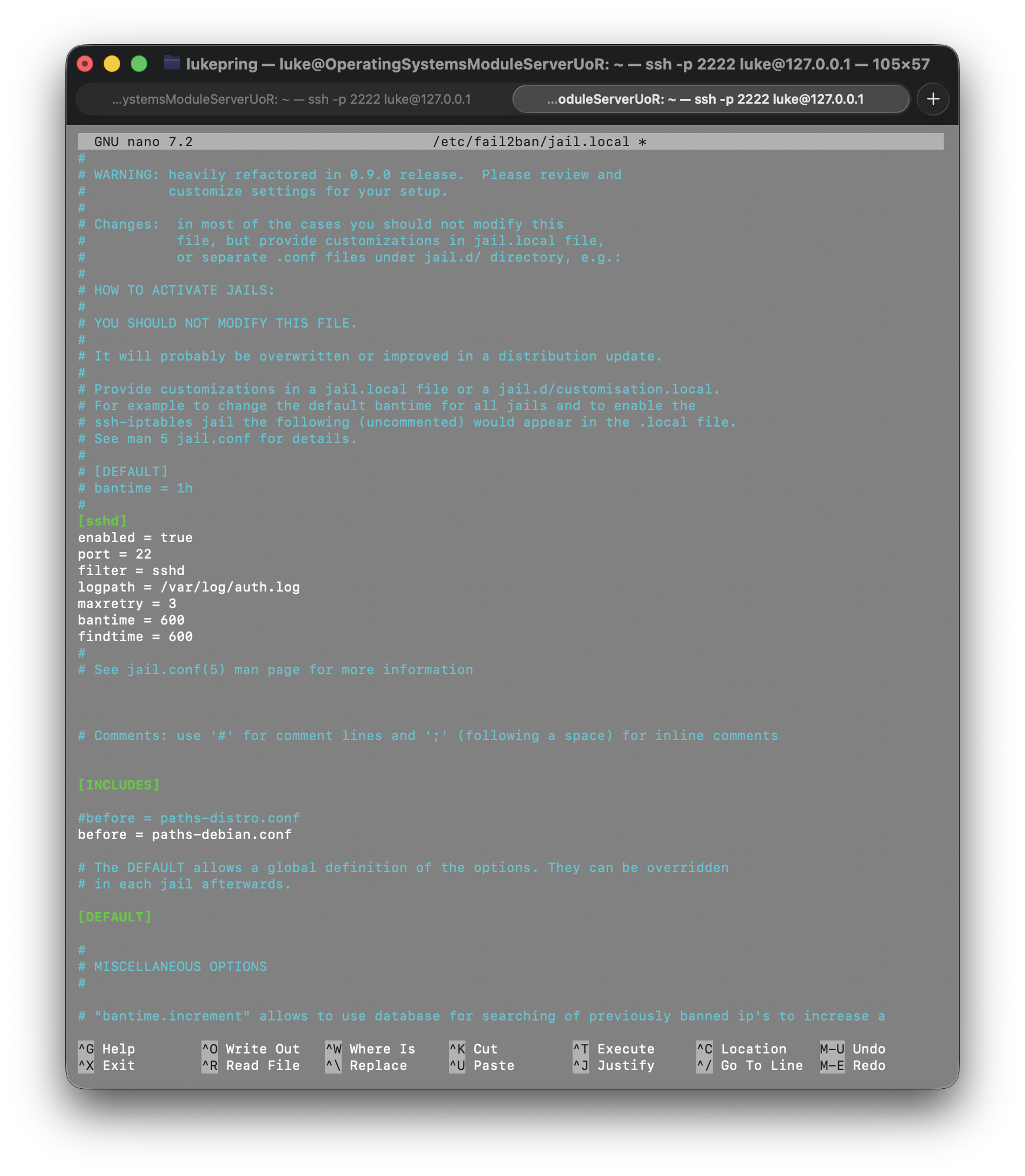 And then edited the config using the sudo nano /etc/fail2ban/jail.local command. Below is a