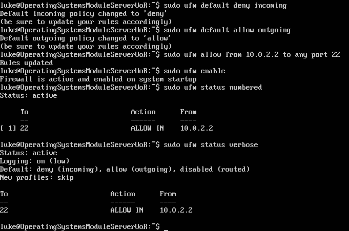Once I had confirmed UFW was installed, I then began setting the rules for my firewall. I used the commands below: