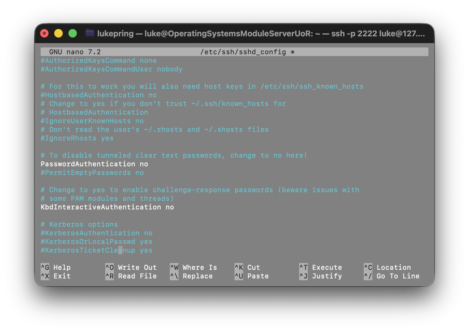 command. Then, I edited the configuration file using sudo nano /etc/ssh/sshd_config. I