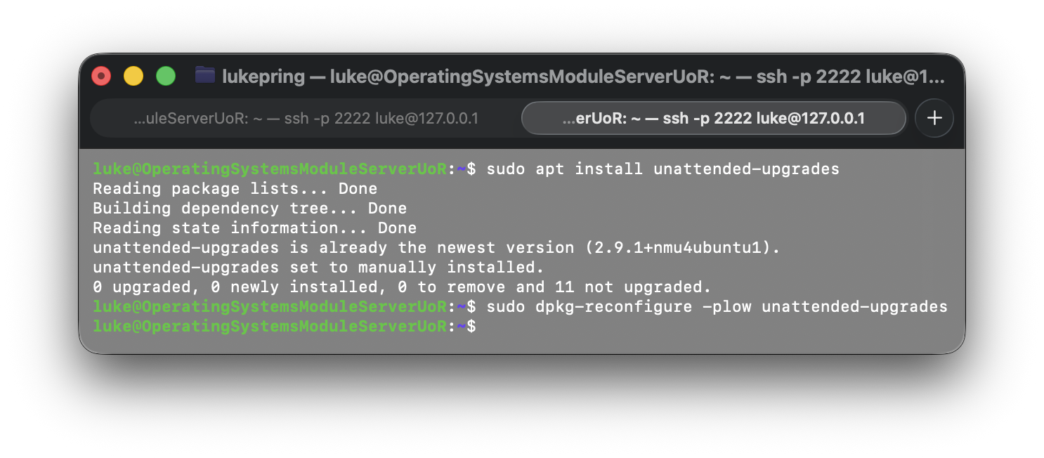 To configure automatic security updates, I first installed the unattended-upgrades package using the
