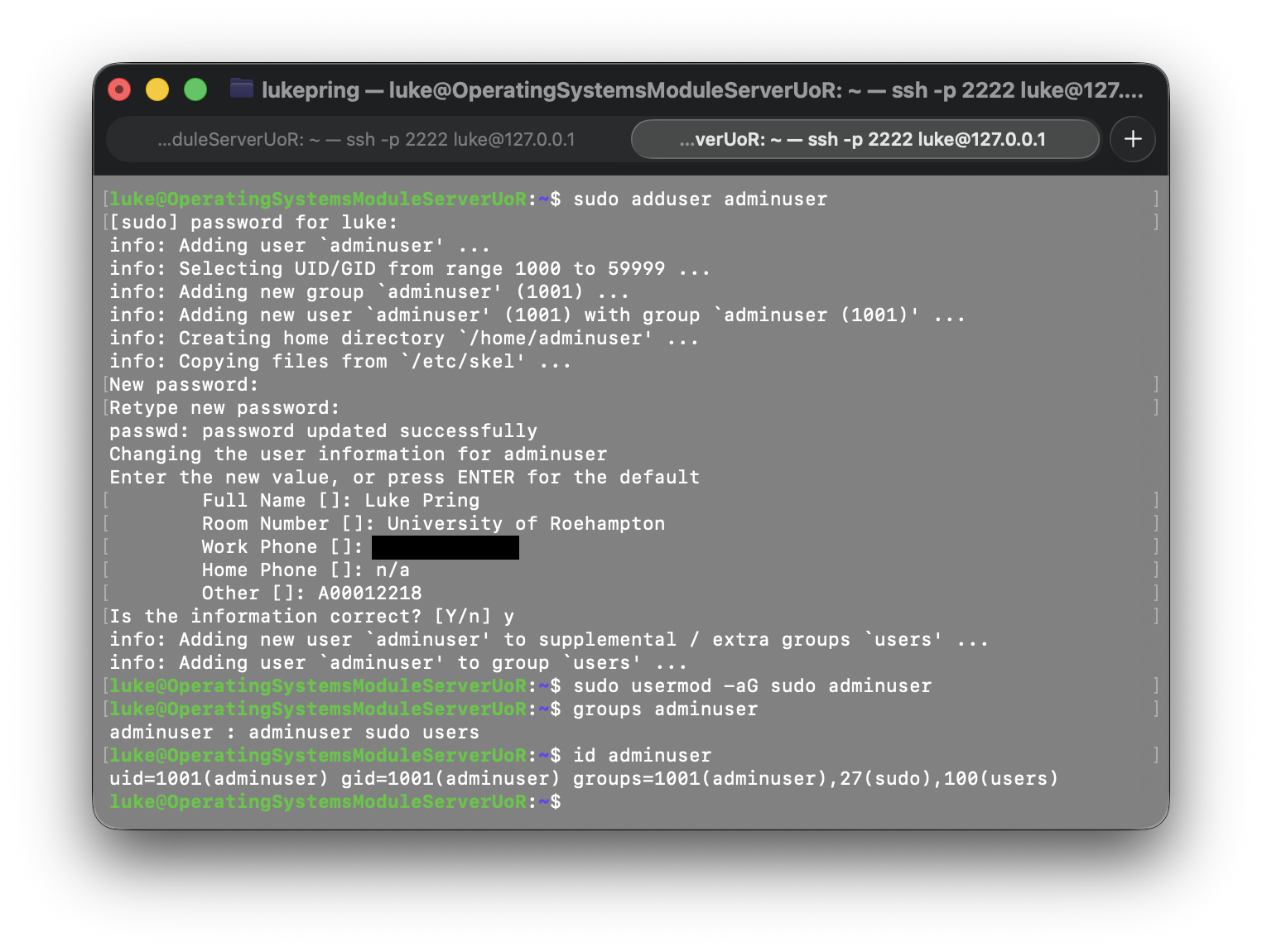 I also used the id adminuser command to verify that the user was added to the sudo group.