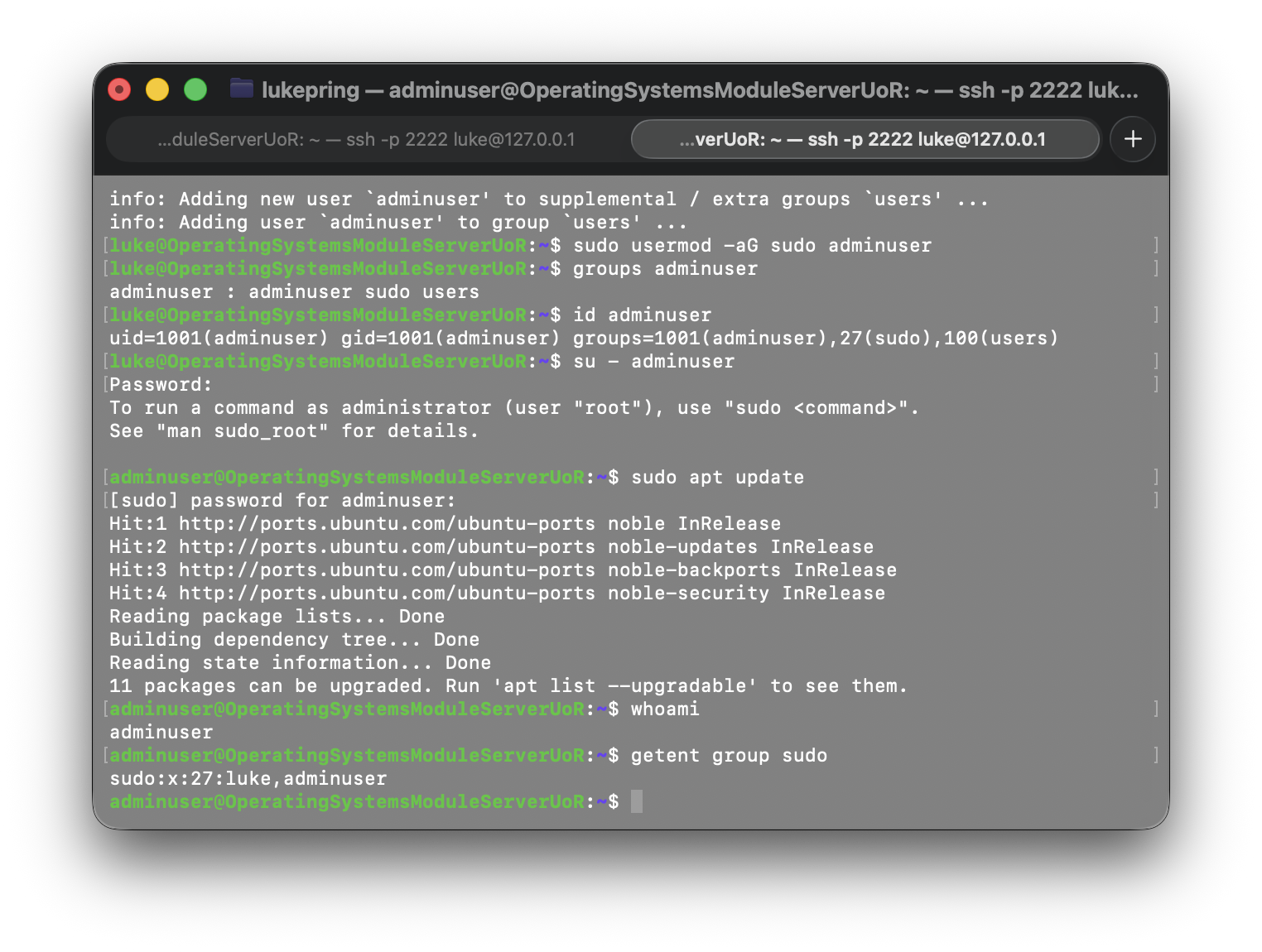 Then, I added the user to the sudo group using the sudo usermod -aG sudo adminuser command.